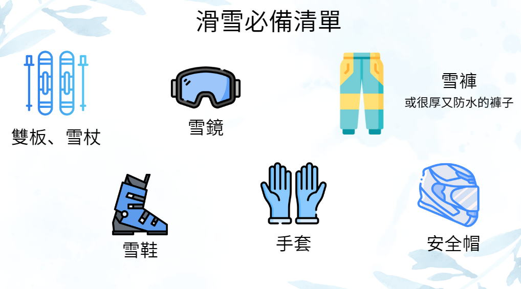 在開始滑雪之前,花一些時間觀察滑雪場的地形,對雪道的坡度、長度和狀況有基本的概念。這能幫助初學者選擇更適合自己練習的路線,也能減少因地形不熟導致的突發狀況。 - 防護裝備必不可少