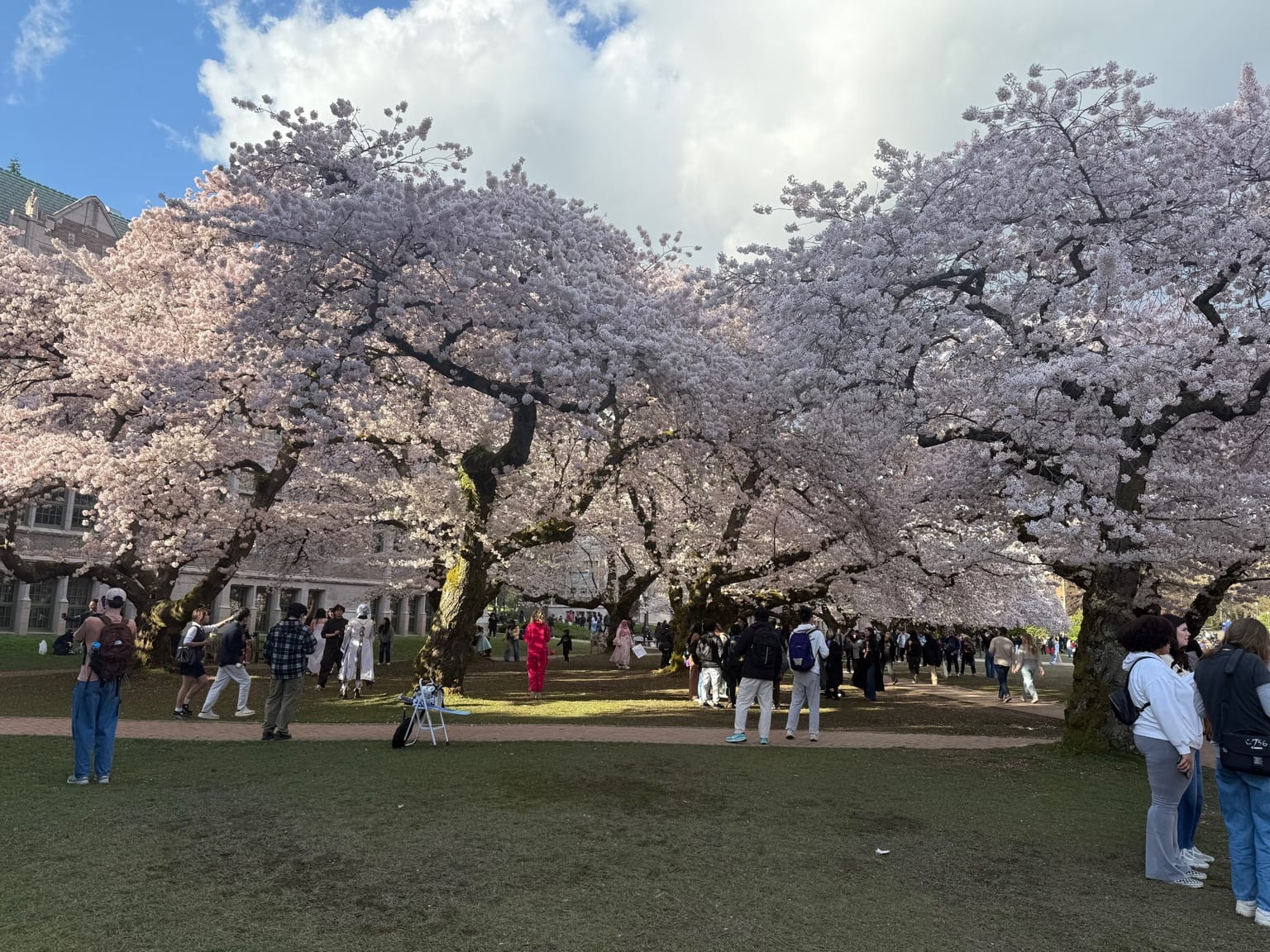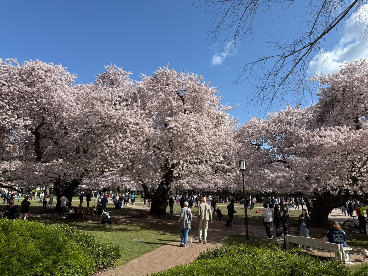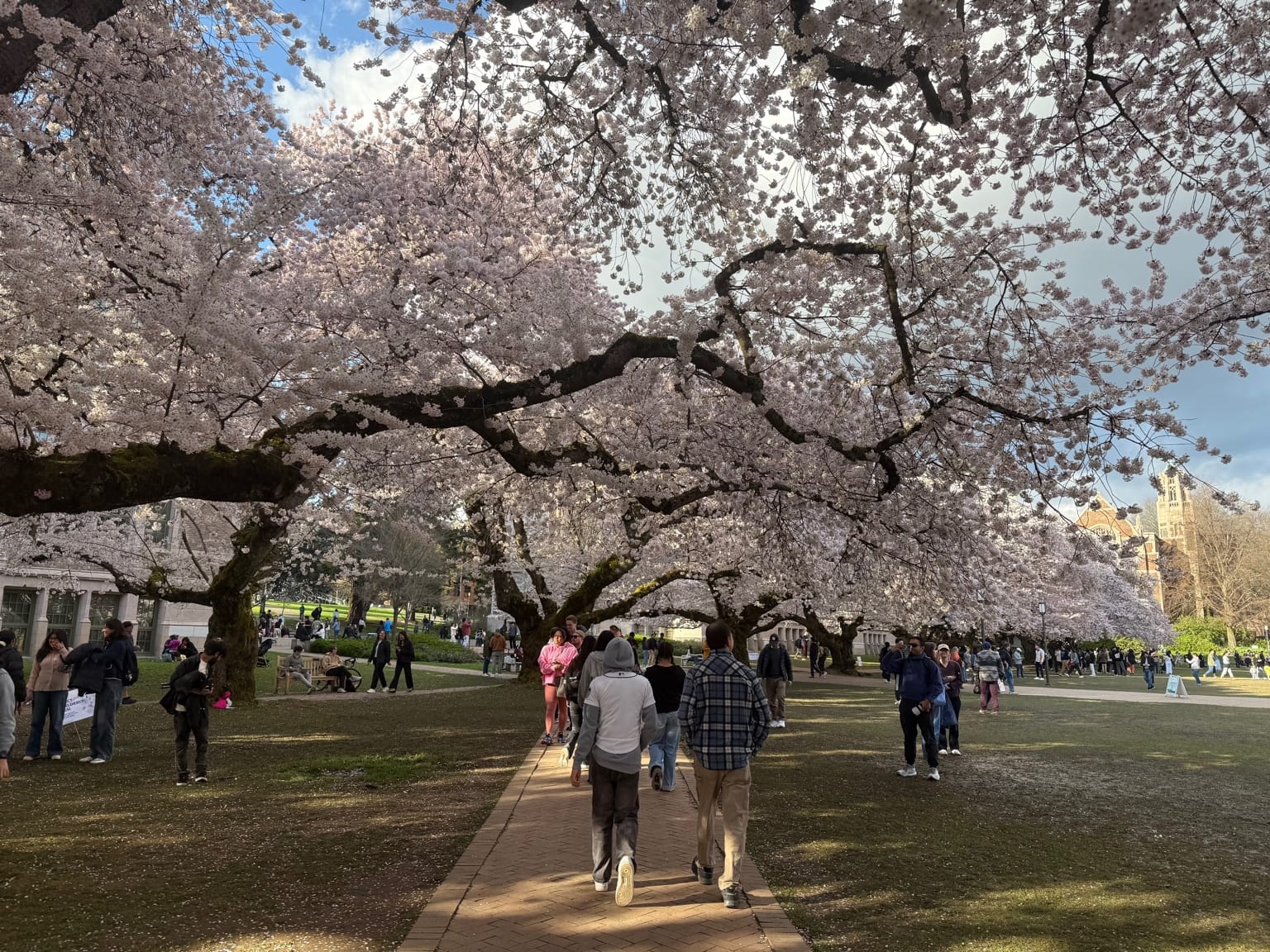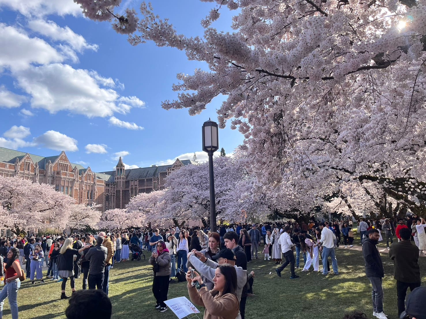 說到華盛頓大學最大的特色,我覺得莫過於每年三月底到四月初的櫻花季。櫻花大約會盛開兩週左右,滿開的時候真的非常壯觀,美得令人讚嘆。不過我也發現,櫻花凋謝得非常快,所以如果你剛好在這段時間來到西雅圖,一定要排個行程去賞櫻,這是絕對不能錯過的。